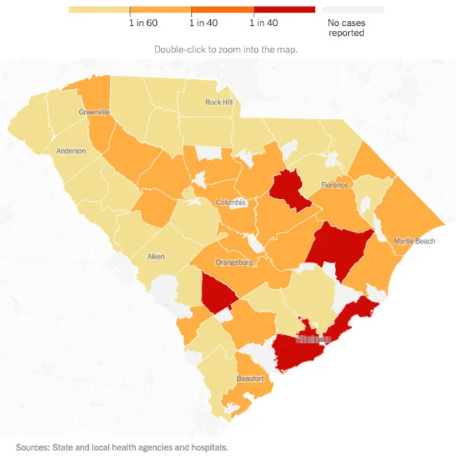 Avoid travel through tourist areas and the state capitol Columbia. However, rural South Carolina in the western regions continue to see lower rates of COVID—indicating a strong correlation between nightlife and the rate of viral spread.